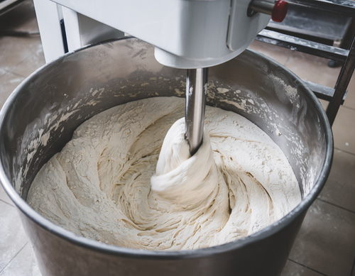 小麦粉、水、イーストなどをミキサーで混合し、パンの“生地”をつくります。